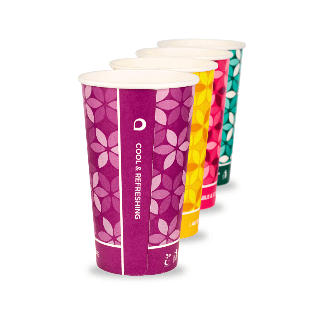 16oz compostable double PLA coated paper cups for use with cold drinks. This box contains mixed coloured cups, as per the image.