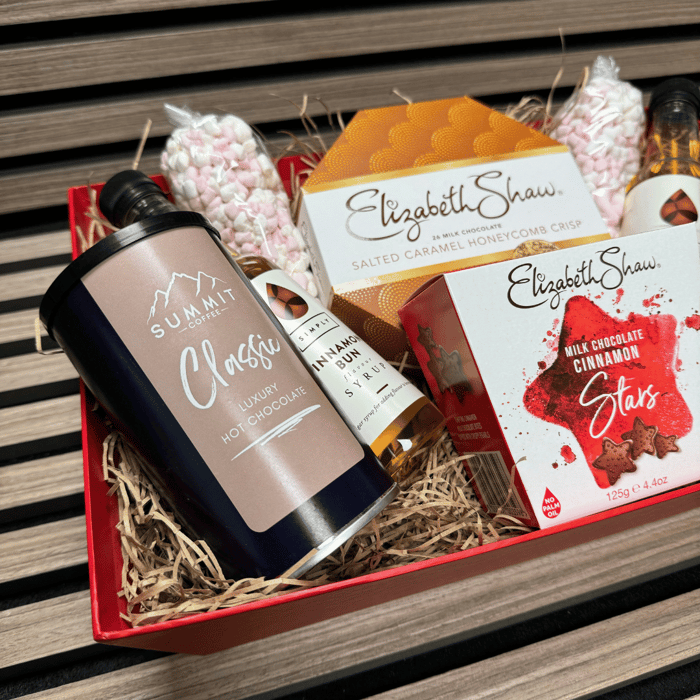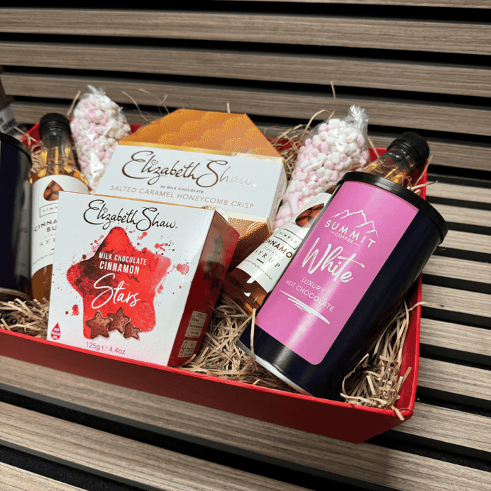 Treat yourself to our Festive Cinnamon Hot Chocolate Hamper! Delight in two rich hot chocolate flavours—Summit Classic and White chocolate powders—then add a touch of warmth with Simply’s Cinnamon & Cinnamon Bun mini syrups. Top it all off with a sprinkling of marshmallows and a delicious side of cinnamon star chocolates for the ultimate cozy indulgence. Perfect for the season!