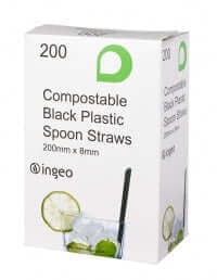 Black Biodegradable & Compostable Spoon Straws In Dispenser case of 200. Straws are produced from food-grade PLA which meets all European regulations.