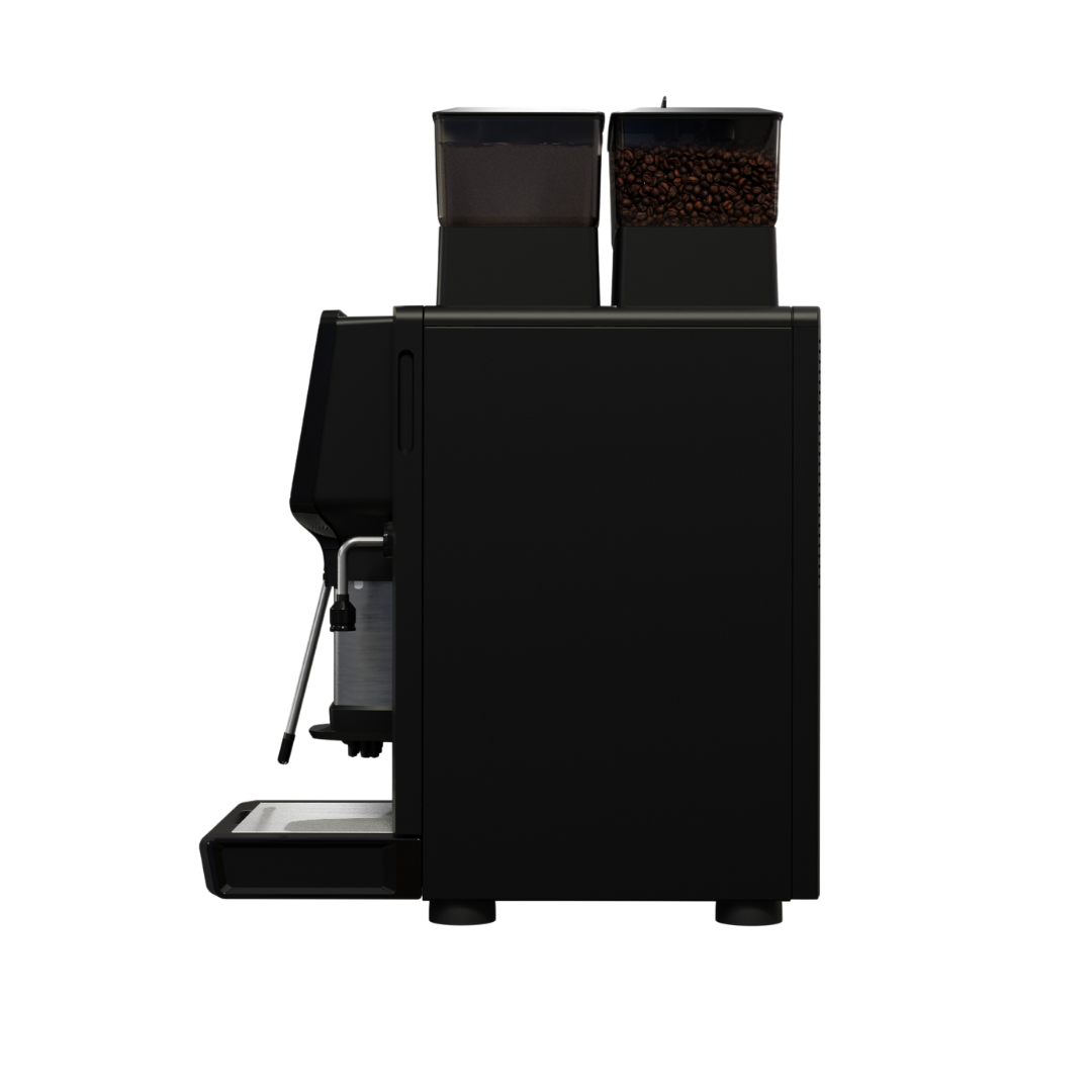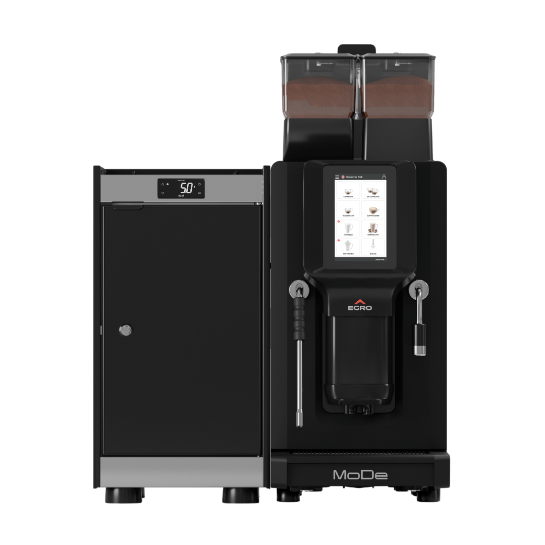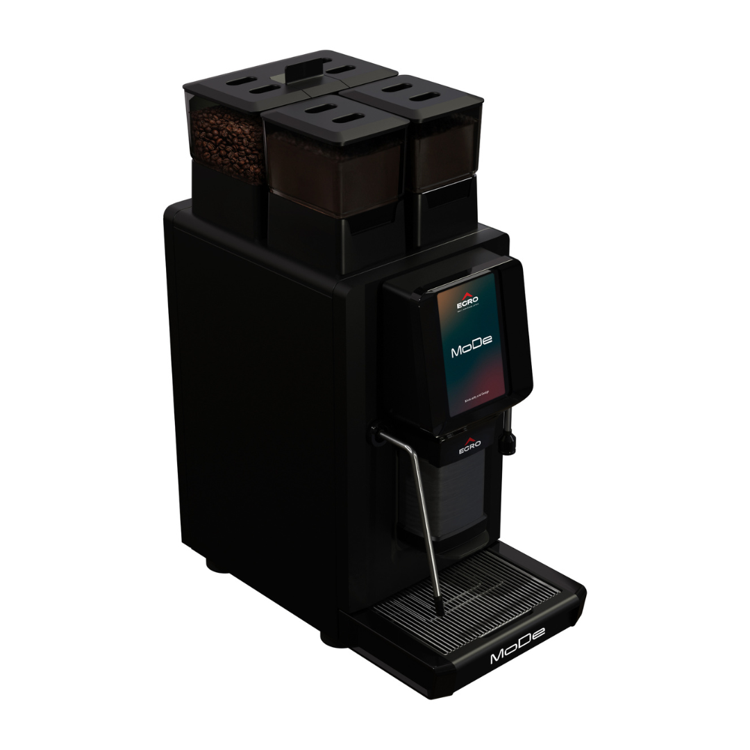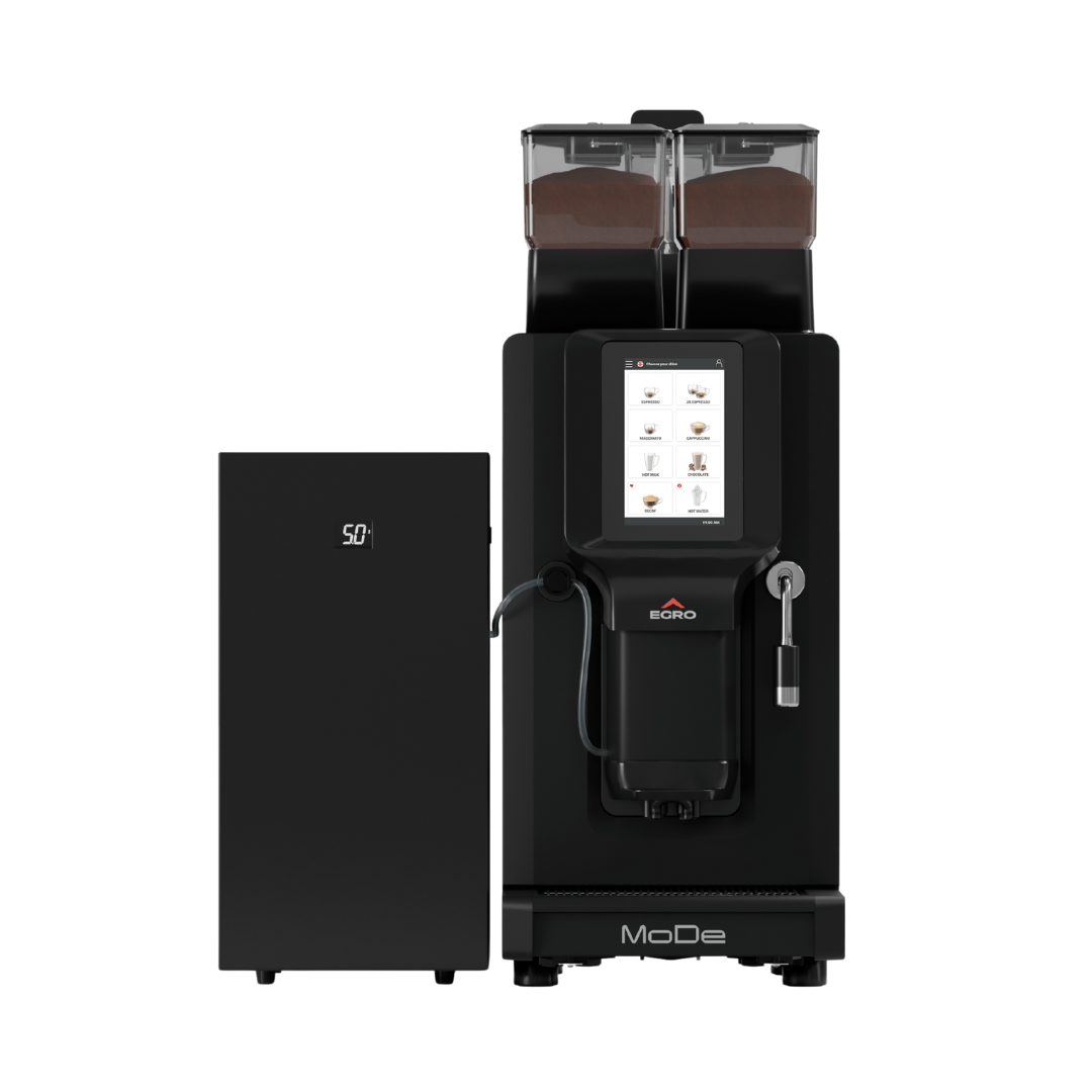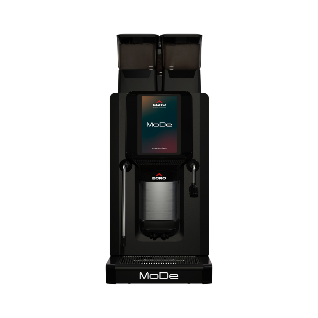 MoDe packs Egro’s latest tech into a 30 cm-wide chassis with built-in hoppers and a clear 7″ HD touchscreen. Recipes are easy to create, brand and reorder, with passworded access levels for barista, manager and technician. Internals are arranged in service-friendly modules to reduce downtime and speed maintenance.