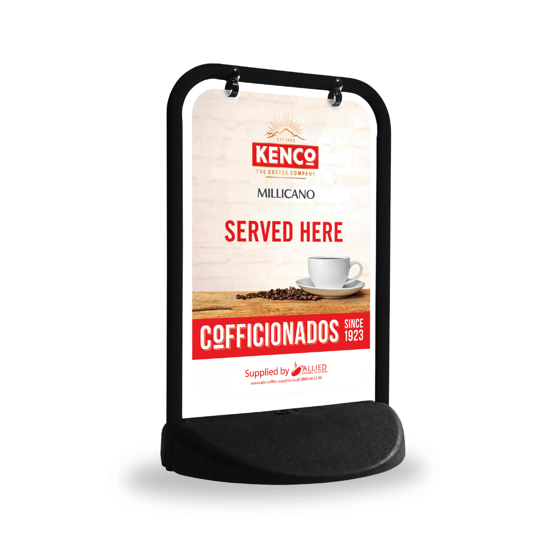 Catch the eye of passing customers and promote your coffee sales with the Kenco Millicano double-sided eco pavement stand. Engineered with a low centre of gravity for maximum stability, and a solid recycled PVC base.