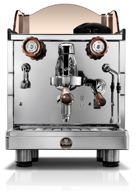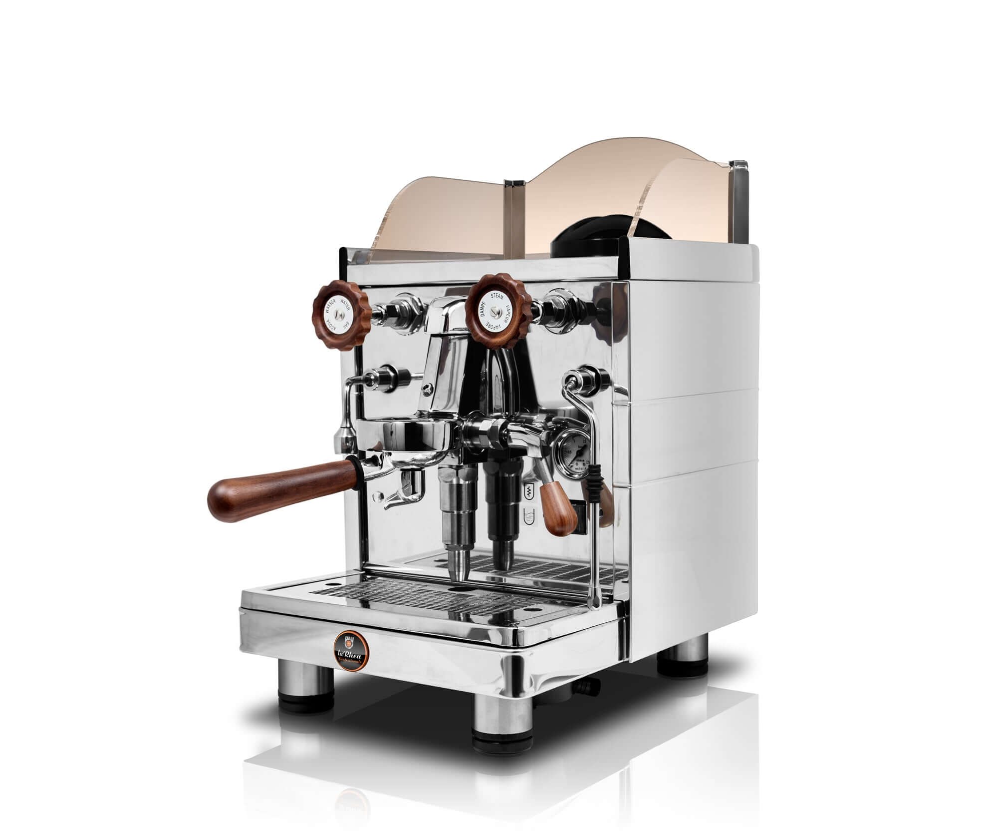 The Mininova is a small single-group machine that fits virtually anywhere. The aesthetic simplicity of the exterior; stripped bare of digital bells and whistles, is accentuated by retro-style details like the natural wood finishes on the valve knobs, filter handle and levers.
