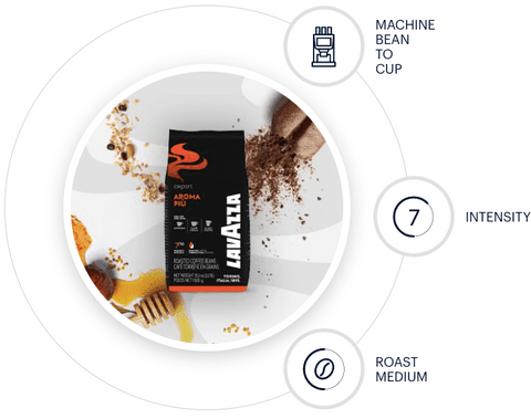 Lavazza Aroma Più coffee beans offer a velvety cream and a persistent aroma, from a blend of coffees. Enjoy scents of honey and almond for a sweet, creamy espresso.