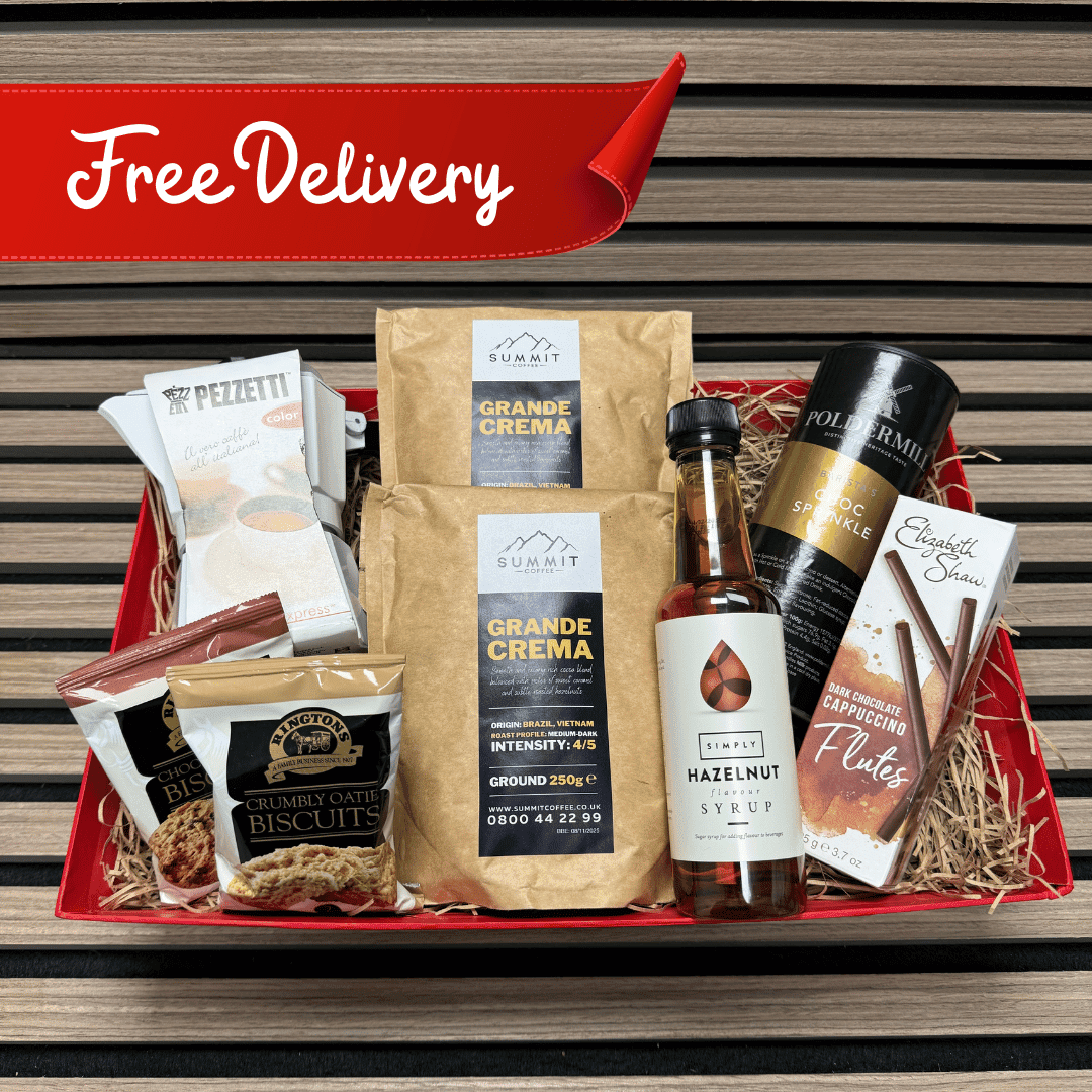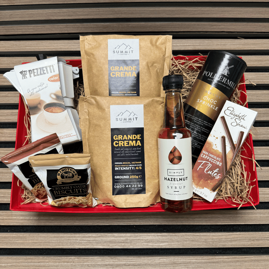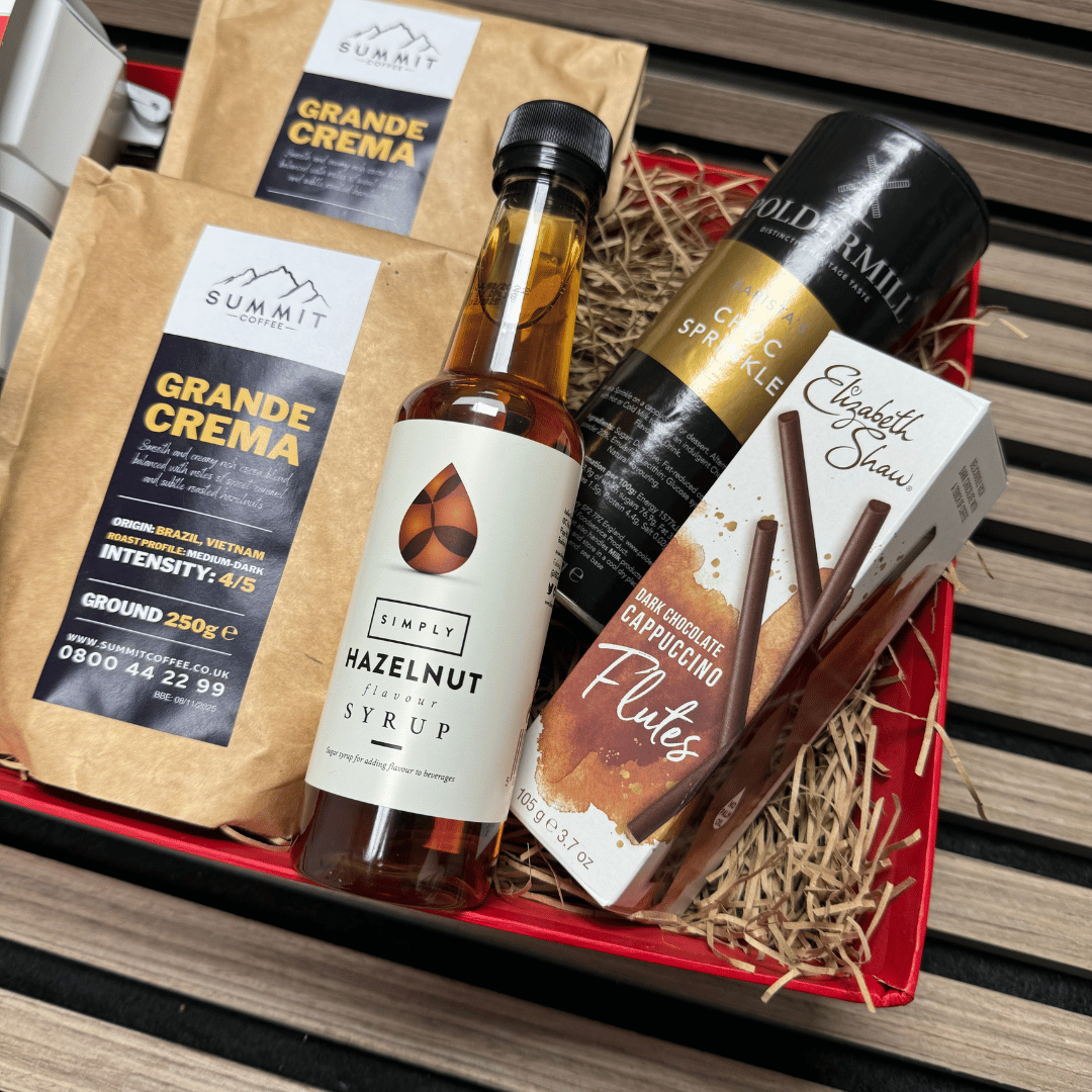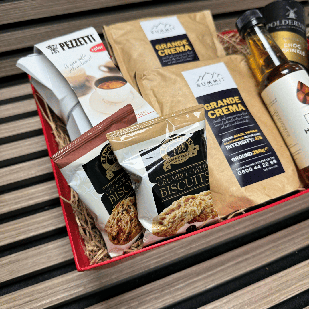 The ultimate hamper for the coffee enthusiast in your life! This thoughtfully curated gift includes a Pezzetti Italexpress 3-cup Aluminium Moka Pot, paired with two packets of our best-selling Summit Grande Crema ground coffee. To enhance the experience, we’ve added a Poldermill chocolate sprinkle, a mini Simply Syrup, and a selection of delicious Ringtons biscuits. Perfect for a cozy coffee moment!