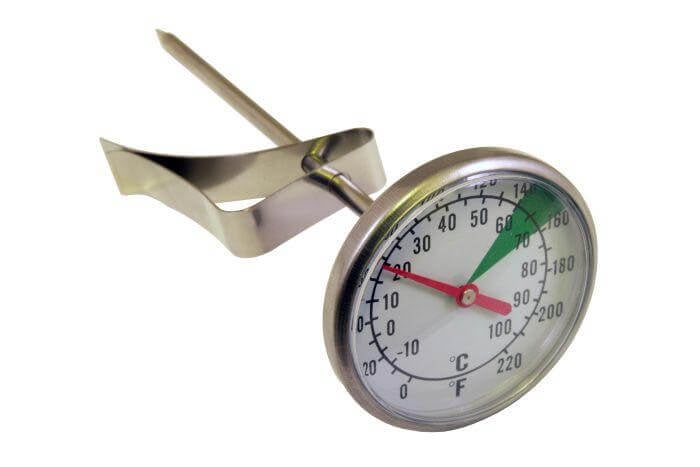 Dual dial 5″ thermometer from Motta, with clearly marked optimum frothing zone indicator. Easy to read face, stainless steel clip holds it firmly in place