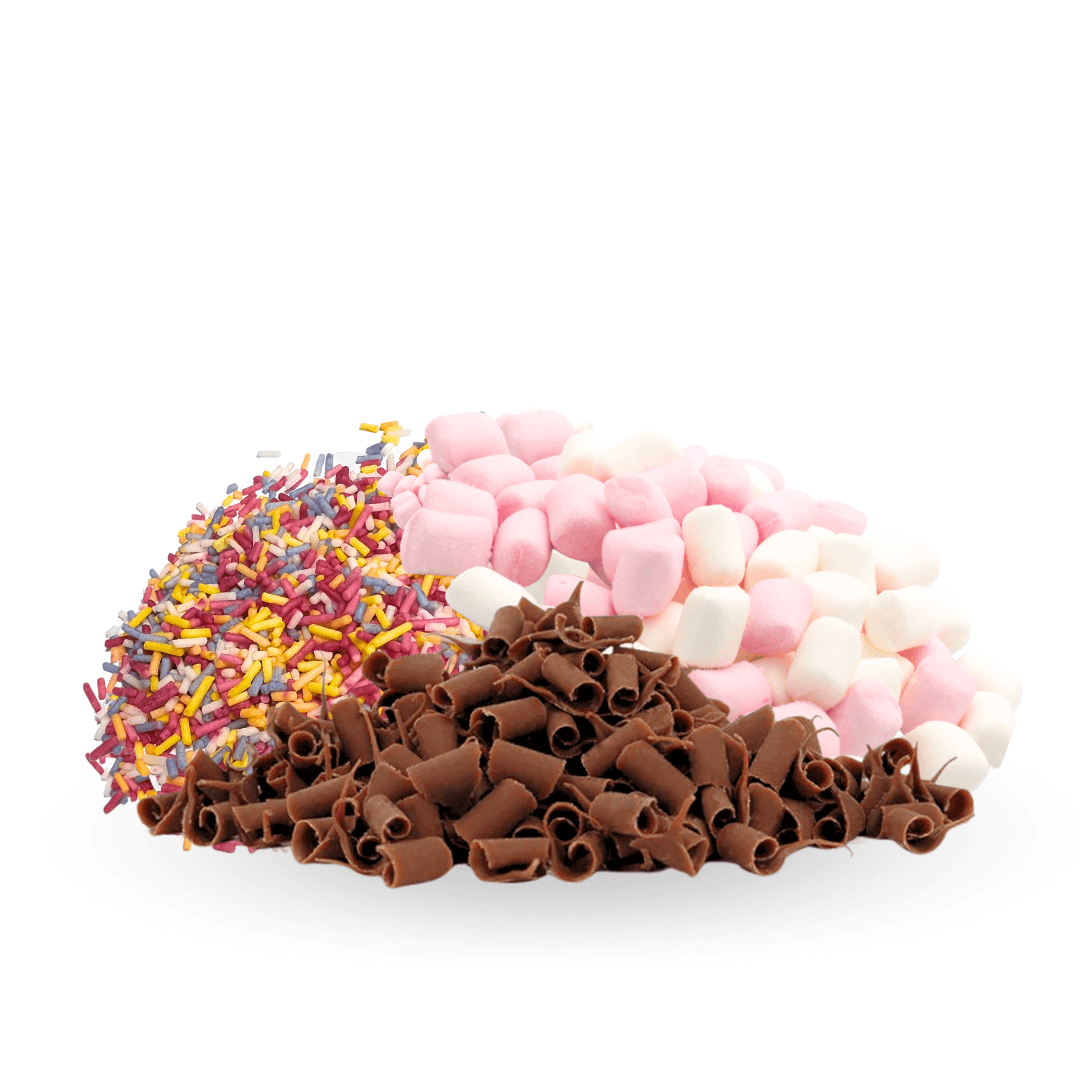 Top your Shmoo milkshakes with these yummy Shmoo toppings. This package contains all three Shmoo toppings; Pink & White Micro Marshmallows, Milk Chocolate Curls and Rainbow Strands.