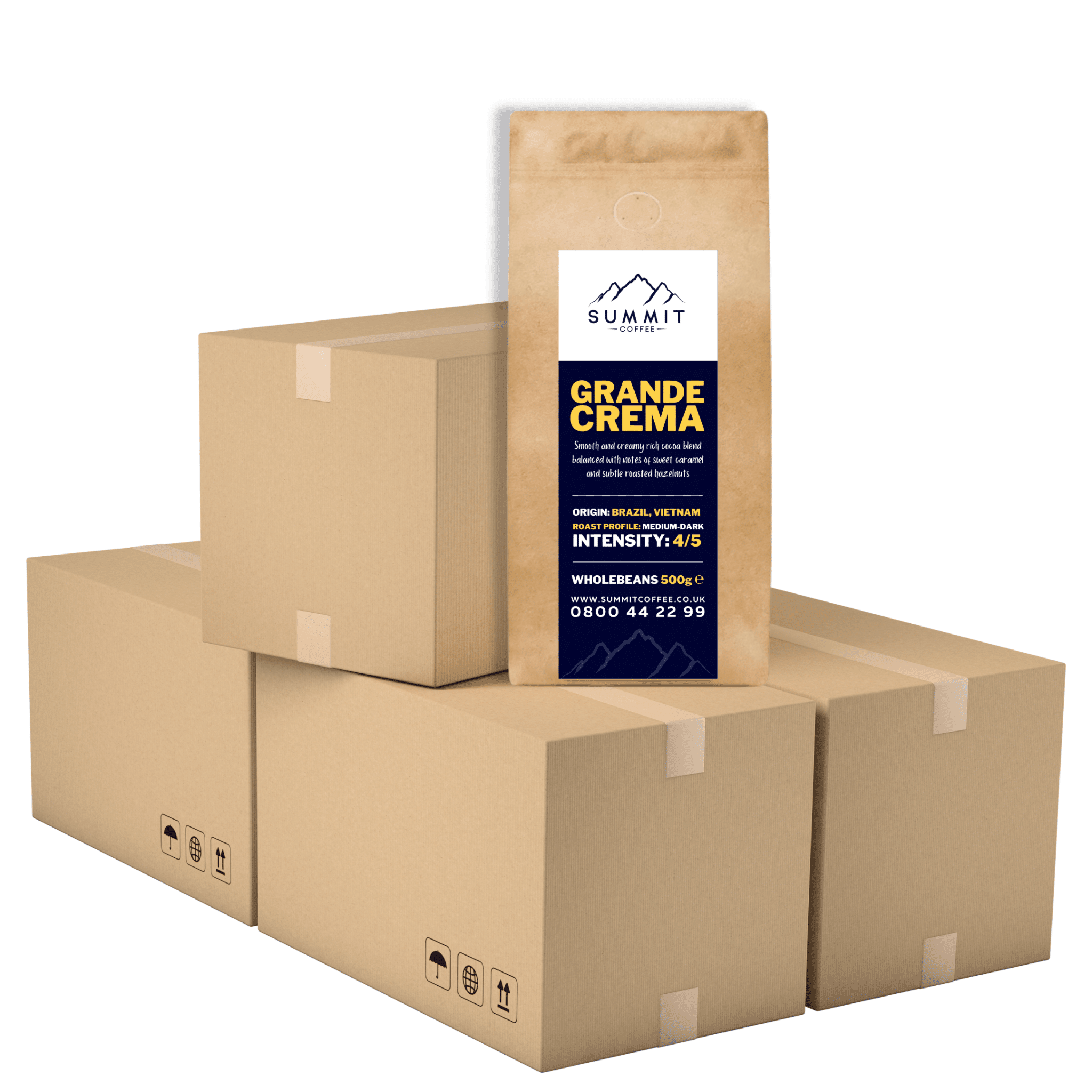 Our Summit Grande Crema is a smooth and creamy rich cocoa blend balanced with notes of sweet caramel and subtle roast hazelnuts. Enjoy a creamy mouthfeel with a persistent finish and a wonderful thick crema.