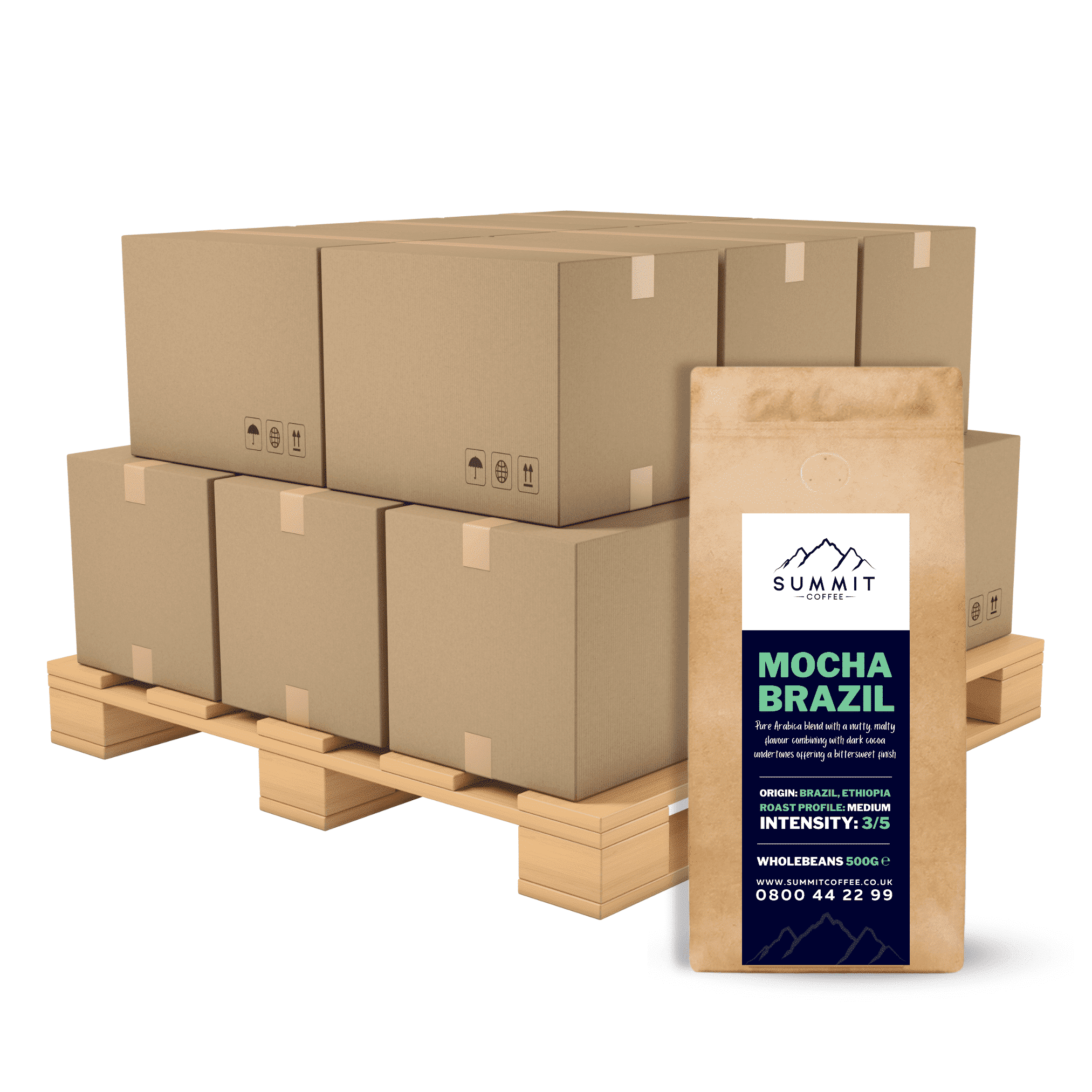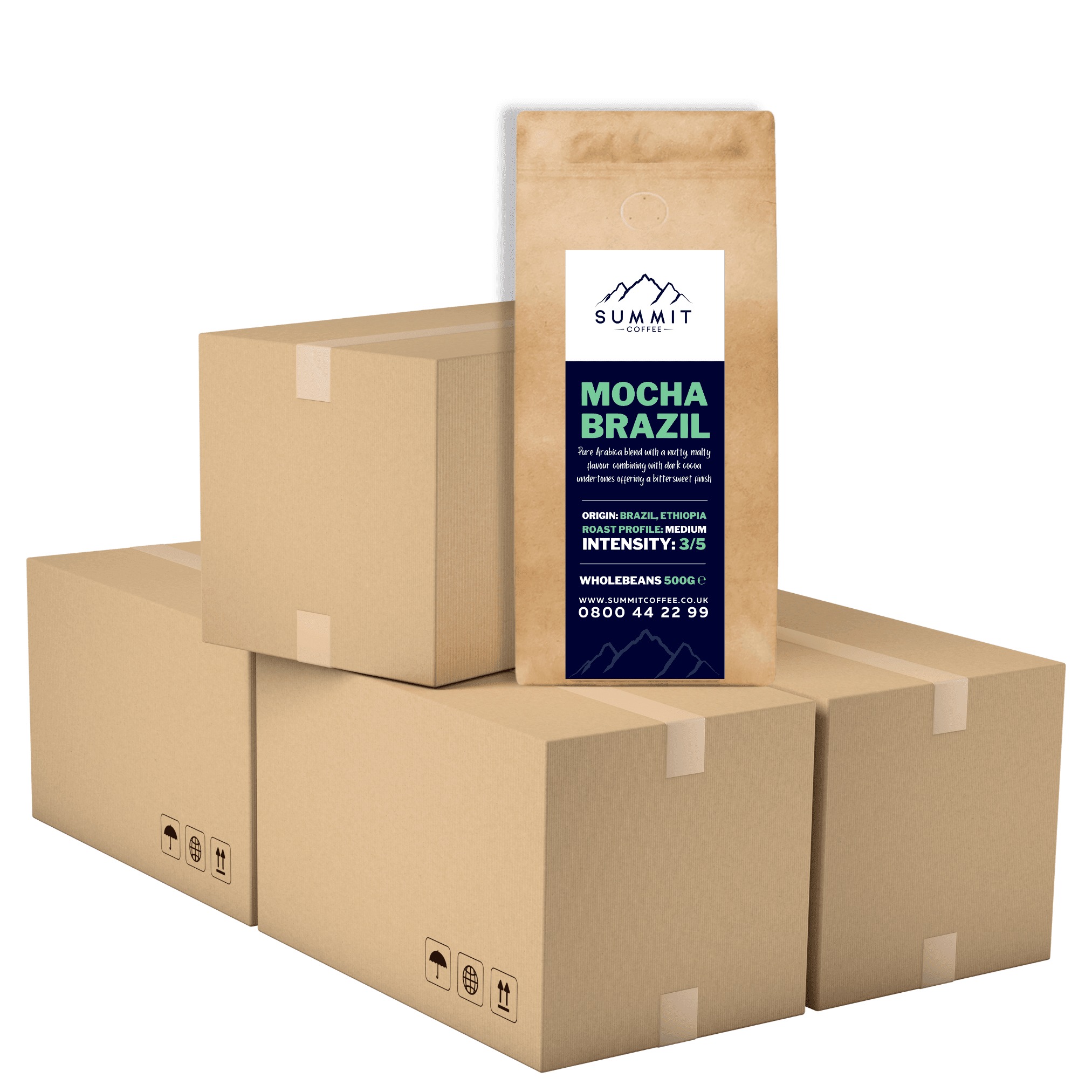 Our Summit Mocha Brazil is our wonderful house blend. Pure Arabica blend with a nutty, malty flavour combining with dark cocoa undertones offering a bittersweet finish.